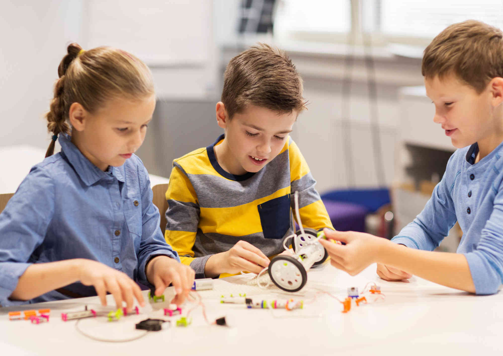 • 7–9 Jahre (Technik-Entdecker): Stromkreise mit LEDs, Sensoren, Motoren und erste Logik-Aufgaben – Technik verstehen und selbst ausprobieren.